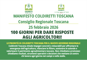 100 giorni per dare risposte agli agricoltori, con interventi operativi capaci di portare risultati concreti al mondo delle imprese agricole. Arriveranno in migliaia, da ogni angolo del Granducato — dal borgo più remoto alle isole — con slogan, cartelli e campanacci, per consegnare alla politica regionale, riunita a Palazzo del Pegaso per la seduta del Consiglio, la piattaforma programmatica di Coldiretti Toscana con i dodici punti che indicano le priorità per il sistema agricolo regionale.