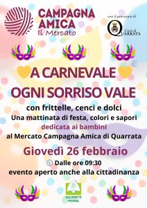 Festa per bambini, degustazioni a ‘filiera corta’ al Mercato Campagna Amica Dopo 2 rinvii, causa maltempo, finalmente giovedì 26 febbraio mattina, ci terrà la Festa di Carnevale al Mercato Campagna Amica di Quarrata in piazza Risorgimento: tra tradizione, filiera corta ed educazione alimentare.